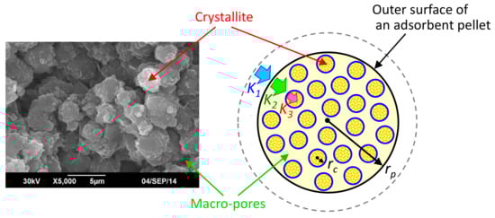 From the results in Figure 8, it is estimated that the gas diffusion inside an adsorbent pellet occurs in accordance with the effect of a hierarchal pore structure consisting of the macro-pores between crystallites and micro-pores in the crystallite, which creates sequential gas diffusion steps. In addition, an external gas diffusion layer outside the pellet surface is also created and has some effect on the overall gas diffusion behavior. Figure 9 shows a schematic image of the hierarchal pore structure and the gas diffusion into an adsorbent pellet having a pellet radius of rp. The gas diffusion stages are indicated by the different colors of the bold arrows. In Figure 9, K1 is the volumetric mass transfer coefficient in the external gas diffusion layer, and its value depends on the gas flow conditions around the outer area of the pellet. K2 is the volumetric mass transfer coefficient in the macro-pores between crystallites, which is closely related to the macro-pore size inside the pellet. K3 is the volumetric mass transfer coefficient in the micro-pores inside a crystallite having a radius of rc. From the SEM image in Figure 9, the size of the crystallite seems not to be uniform; therefore, rc can be roughly characterized by the average size of the crystallites inside the pellet.