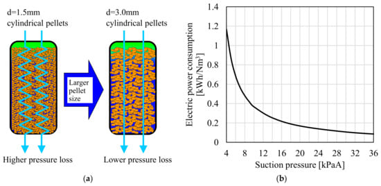 Reduction of electric power consumption of vacuum pump by using larger size adsorbent pellets. ((a) Schematic image of pressure loss reduction inside adsorber; (b) Relationship between suction pressure and electric power consumption of vacuum pump estimated from performance curve).
