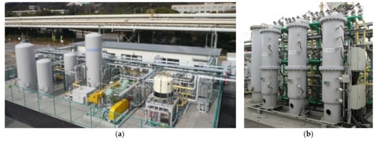 Exterior of CO2-PSA pilot plant “ASCOA-3” [] [Advanced Separation system by Carbon Oxide Adsorption, plant capacity: >3 t-CO2/day] ((a) Bird’s-eye view of plant; (b) Adsorbers (3 towers)).