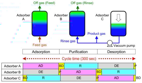 Especially when a CO2-PSA process is designed to handle a huge amount of gases, the optimum design of the PSA plant is very important for ensuring a higher CO2 throughput, higher purity of the recovered CO2, and minimum electric power consumption for CO2 separation. Ga et al. introduced new performance indicators of various adsorbents including Zeolite 13X to estimate the efficiency and product purity of CO2-PSA [,]. They compared performance indicators obtained from both laboratory data and the results of rigorous PSA simulations and suggested their practical utilization, although some improvement in prediction accuracy is still required. Zhang et al. proposed a multilayered bed of CDX alumina and NaX (13X) zeolite for CO2 separation from high humidity flue gases []. The water front in CDX alumina can be stabilized by properly designing the bed layers.