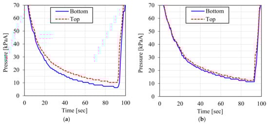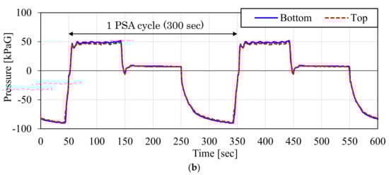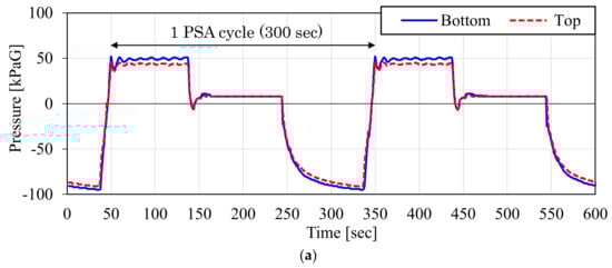 Figure 15 shows the measured pressure inside the adsorber during the CO2-PSA cycle in the ASCOA-3 pilot tests. In each graph, the dotted line shows the pressure at the top of the adsorber, and the solid line shows the pressure at the bottom of the adsorber. The time range illustrated by the bidirectional arrow is one cycle of CO2-PSA. Figure 15a shows the results with the d = 1.5 mm smaller adsorbent pellets (Case 1), and Figure 15b shows the results with the d = 3.0 mm larger adsorbent pellets (Case 2). Due to the effect of the pellet size difference, the gap between the dotted line and the solid line became smaller in Case 2 compared to Case 1. This pressure gap was observed in both the gas adsorption step in the positive pressure range and in the gas desorption step in the negative pressure range. Because the electric power consumption of the vacuum pump is the most cost-intensive factor in these cases, the pressure gap and the minimum desorption pressure in the gas desorption step substantially decide the efficiency of this process.