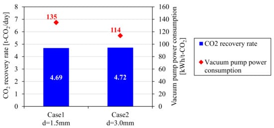 Figure 17 shows the measured CO2 recovery rate and the vacuum pump power consumption per unit CO2 amount in the ASCOA-3 pilot tests. The CO2 recovery rates of the two cases were almost equal owing to the power control of the vacuum pump. However, the vacuum pump power consumption decreased significantly in Case 2 operation in comparison with Case 1 operation. The pressure loss inside the adsorber generally creates a pressure distribution inside the adsorbent bed, and as a result, an excessively lower pressure is required during the gas desorption step in order to achieve the target CO2 recovery rate. According to the performance curve of the vacuum pump in Figure 10, the efficiency of the vacuum pump is improved by increasing the suction pressure. The reduction in vacuum pump power consumption is estimated to be achieved by the effect of the increase of the minimum gas desorption pressure from 6 to 10 kPaA observed in Figure 16. The durability of Zeolite 13X adsorbent under the same feed gas condition was already verified by a pilot-scale CO2-PSA operation in our previous work [], and therefore, the superior performance of the larger size adsorbent is expected to gives us a great advantage for a long term operation of CO2-PSA.