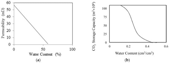 In relation to coal permeability variation with moisture content, the coal mass tends to shrink with the reduction of its moisture content, creating permeability enhancement in the coal seam [20]. The moisture in the coal mass pore structure occupies the pore space available for fluid movement and the adsorption of that water in the coal matrix induces significant matrix swelling, both of which obstruct the flow paths available in the coal matrix and therefore cause the reduction of overall coal seam permeability [20]. The variation of coal seam permeability and gas storage capacity with the natural moisture content have been studied by Skawinski et al. [20] and Perera et al. [21] and the results are shown in Figure 1. Regarding the moisture content effect, deeper coal seams generally have water-saturated conditions compared with shallow seams and thus are expected to have low permeability.