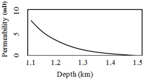 On the basis of all of these facts, since deeper coal seams have greater effective stresses, higher-rank coals and water saturation condition, deep coal seams generally have very low permeability values. However, the temperature influence is the opposite, and most available coal seams have less than 0.001 mD extremely low permeability values [29]. The variation of coal seam permeability with depth predicted by Korre et al. [30] is shown in Figure 2.