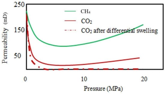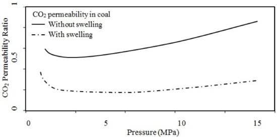 Injection of CO2 into a natural coal seam enhances its pore pressure and this pore pressure effect on coal permeability has been examined by many researchers. According to Palmer et al. [50] and Pekot et al. [51], in the primary recovery of coal beds, firstly coal mass permeability reduces with increasing pore pressure and then tends to increase as the adsorbed gas tends to desorb with the opening and expansion of existing cleats/fractures. A similar experimental observation on coal permeability with CO2 pore pressure was reported by Liu et al. [52]. According to these researchers, increasing the CO2 pore pressure inside the coal mass reduces its permeability by up to around 3.5 MPa, mainly due to coal matrix swelling, and further increasing the CO2 pore pressure tends to increase permeability due to the coal matrix shrinkage caused by the high-pressure fluid (Figure 8). However, the CO2 injection pressures considered in this study were quite low and relate to the sub-critical state of CO2.