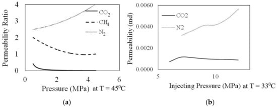 According to the figure, swelling significantly reduces the deep coal seams permeability, and therefore CO2 flow behaviour in natural coal seams varies significantly from the flow behaviours of other types of gases such as N2 in them. This unique flow behaviour of CO2 in coal compared to other types of gases has been shown by many researchers. Cui et al. [37] analyzed the adsorption and transport of CO2 and N2 in coal particles with numerical modelling and found that CO2 can permeate in to ultra-micro pores, resulting in a higher diffusivity in coal matrix, than CH4 or N2. This is due to relatively smaller kinetic diameter, linear shape and the high affinity of CO2, which allow it to permeate not only to macro pores but also to micro and ultra-micro pores as well [38,39]. Also the significantly reduced coal mass permeability upon CO2 movement compared to other gases has been clearly shown (Figure 5) and CO2-induced coal matrix swelling was found to be the main cause for this reduction [3,35,40,41]. Figure 5a shows that CH4 has lower permeability values compared to N2 and for this reason CH4 causes a considerable swelling effect in coal. However, the swelling-related issues caused by CO2 are much greater than those caused by CH4. According to Larsen [42], the coal mass can swell by up to 4% of its volume due to CO2 adsorption, which pressures the fractures and cleats in the coal mass, thereby reducing its permeability. For example, the Tahmoor and North Cliff Mines in the Bulli seam exhibited lower gas drainage capabilities due to the available high carbon dioxide concentrations in their coal seam gas [43].