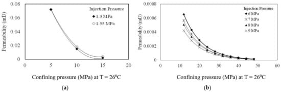The effect of confining stress on coal’s CO2 permeability has been studied by many researchers. According to Siriwardane et al. [46], who studied a Pittsburgh seam coal by changing the confining stress from 20 MPa to 40 MPa and keeping the pore pressure constant, coal permeability exhibits a steep reduction trend with increasing confining pressure due to the shrinking of internal coal fractures at higher confining pressures, which eventually reduces its permeability. Vishal et al. [40] checked the confining stress effect on CO2 permeability for Indian bituminous coal samples under two different pore pressure conditions and observed similar reductions in permeability for both pore pressures due to the closing of internal fractures under high confining pressures [47], and increasing the confining stress from 5 to 15 MPa caused permeability to be reduced by around 100% (Figure 7). A similar CO2 permeability reduction with increasing confinement has been shown by Perera et al. [48] for Australian bituminous coal at greater confinements.