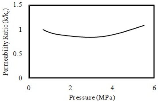where , and and are the original reservoir porosity, the original pressure (MPa) and the matrix shrinkage compressibility, respectively. This equation also can be used to predict permeability by combining it with Equation (19). Here, the first terms describe the effective stress influence and the last term describes the matrix shrinkage influence. According to the researchers, this equation can be reduced to the following simpler model if the compressibility factor, is constant, although it will not be constant practically as it varies with medium porosity and Young’s modulus: