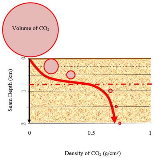 Depending on the pressure and temperature, CO2 may exist in three main states: gas, liquid and super-critical, and under ambient conditions CO2 is a thermodynamically-stable heavy gas, and when the temperature goes beyond 31.8 °C and pressure goes beyond 7.38 MPa (critical point), CO2 converts to its highly chemically-reactive super-critical state. The flow behaviour of CO2 is largely dependent on this phase condition. Interestingly, super-critical CO2 has properties of both gas and liquid CO2, and its gas-like compressibility values lead to the easy filling of all the available volume, and its liquid-like density values that vary from 200 to 900 kg/m3 depending on the pressure and temperature, lead to more stable storage. As shown in Figure 9, super-critical CO2 has much greater compressibility values than liquid CO2 and therefore occupies much smaller space deep underground with the potential occurrence of phase transition. As a result, it is possible to store significantly larger amounts of CO2 in deep coal seams in its super-critical state and deep seams are therefore preferable for CO2 sequestration.