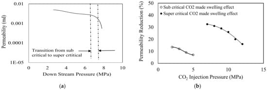 This greater permeability reduction is related to the greater swelling effect created by super-critical CO2 in coal. This greater swelling effect on permeability caused by super-critical CO2 has been shown by Perera et al. [54], and according to these researchers, the permeability reduction with super-critical CO2 adsorption is about two times higher than that with sub-critical CO2 adsorption, and this indicates the significantly greater swelling effect created by super-critical CO2 in coal compared to sub-critical CO2. Further, they observed a reduction of the swelling effect with increasing CO2 pressure, and this observation related to the opening up of coal mass pores and pushing the swelled layers by high-pressure fluid, and the effect increased with increasing pressure. Furthermore, super-critical CO2 creates much stronger bonding with the coal matrix due to its highly chemically-reactive nature, which was confirmed by the observed lower reduction in the swelling effect with increasing injection pressure in super-critical CO2 swelled coal samples [54].