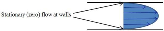 In relation to the Klinkenberg effect in porous media, it is known that gas permeability in any porous medium is much greater than liquid permeability. This suggests that the permeability of a particular pores media depends not only on the medium properties, but also on the flowing fluid properties as well. Therefore, the highly permeability nature of gas compared to liquid in porous mediums is inter-related with the medium behavior as well as flowing fluid behaviour. In fact, Klinkenberg [57] found that the reason for high permeability in the case of gas movement is due to the slip flow between gas molecules and solid walls. In ideal fluid conditions, fluid flow through boundaries is as given in the following figure (Figure 11), where flow adjacent to the boundaries has zero velocities (stable) and the center of the fluid flow has maximum velocity.