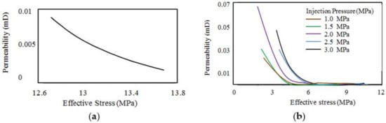 Since effective pressure explains the net effect of pore pressure and confining pressure, it more effectively describes the stress effect on coal mass permeability. The coal permeability alteration caused by effective stress during the CO2 sequestration process has been studied by many researchers. Although, increasing gas pressure during injection reduces gas slip-flow effect, it also decreases the effective stress, which in turn influences the permeability. Yang et al. [60] conducted laboratory experiments to investigate the coupled effect of both slip-flow effect and effective stress and found that the apparent permeability is greatly controlled by these two competing effects. Moreover, according to Vishal et al. [40] and Jasinge et al. [36], CO2 permeability in coal exhibits an exponentially reducing trend with the effective stress applied on it (Figure 12).