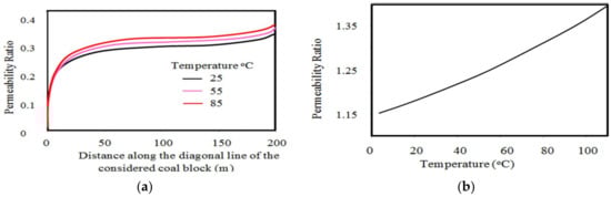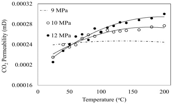 For example, the detailed combined experimental and numerical study of Perera et al. [23] showed a clear increment in CO2 permeability in bituminous coal with increasing temperature (Figure 13) and how it varies with CO2 pressure. According to these researchers, the permeability increment with increasing temperature is only significant at high CO2 pressures (>10 MPa) and is negligible at low CO2 injection pressures (<9 MPa). It should be noted that the researchers used tri-axial undrained experimental conditions to calculate the permeability of coal under varying bed temperature conditions, and at high CO2 injection pressures most of the CO2 inside the coal sample was in the super-critical state when the temperature was above the critical temperature of CO2 (their tested temperatures were 25 to 200 °C). As discussed earlier, super-critical CO2 adsorption in the coal matrix causes it to be subjected to a greater swelling effect and therefore increasing the temperature causes the reduction of this swelling effect. In other words, at high pressure, the swelling effect will be more greatly reduced with increasing temperature and this will result in greatly enhanced coal mass permeability. However, the CO2 permeability enhancement with increasing temperature in coal may be reduced at very high temperatures (>100 °C, in Perera et al. [23]), due to the associated thermal expansion of the coal matrix.