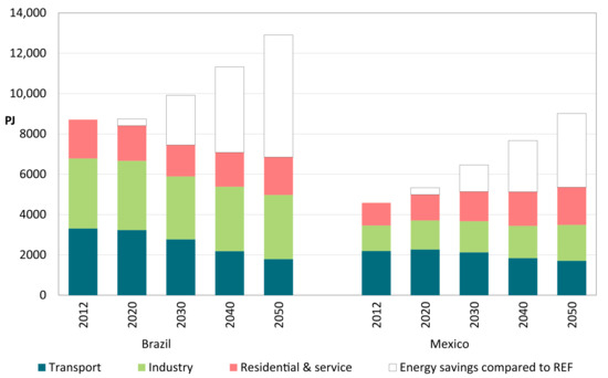 Final energy demand in the REF scenarios is mainly based on the Current Policy Scenario of the World Energy Outlook (WEO) [30], where population growth and economic development are key drivers for energy demand modeling [5,101]. This scenario extrapolates the effect of existing international energy and environmental policies into the future until 2040 on regional level in a business-as-usual approach, but does not take into account any additional policies, incentives or measures to improve energy efficiency or the deployment of renewable energies. For Brazil, the WEO provides a specific national Current Policy Scenario. We adapted the energy demand for our REF energy demand according to a more recent national projection for GDP as presented in [102]. For Mexico, the WEO scenario for the OECD Americas without USA was disaggregated to Mexico, Canada and Chile, using projections of population development data [103], GDP [104] and statistics on national energy demand and supply [105]. We extended the scenarios to 2050 along the trends for GDP and population, similar to [14].