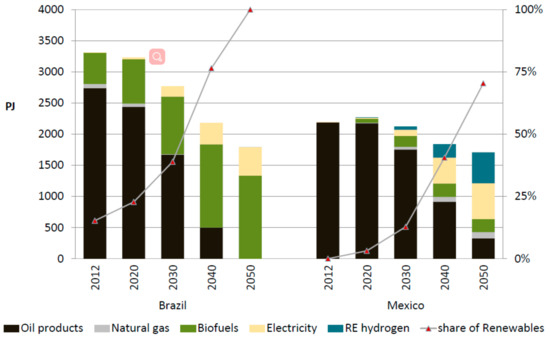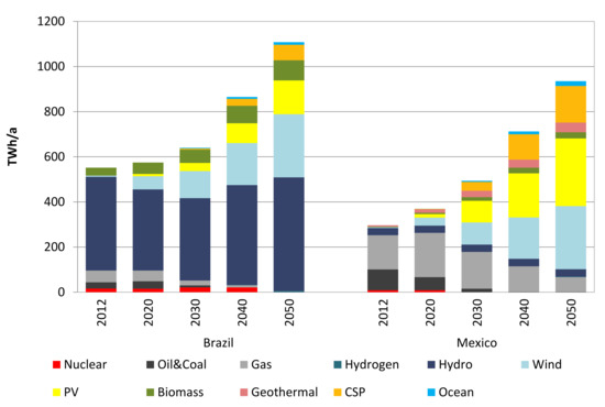 For Brazil, the power sector was separately modeled and validated by coupling the simulation model to the power optimization tool REMix (for details of the methodology see [28,93]). The REMix model for Brazil was adapted from previous studies [72,94]. For our study it was applied in a one year optimization run for the target year 2050. Details on the optimization results are presented in [95]. This validation ensures that all power demand is supplied sufficiently at 8760 h in 2050, considering historic load and weather data. For Mexico no REMix application was available. We therefore applied a capacity factor approach, matching peak load with secured capacity at the same level as today. Capacity factors are based on statistical values from [96]: wind 24%, PV 10%, hydro 37%, nuclear 73%, all others 50%.