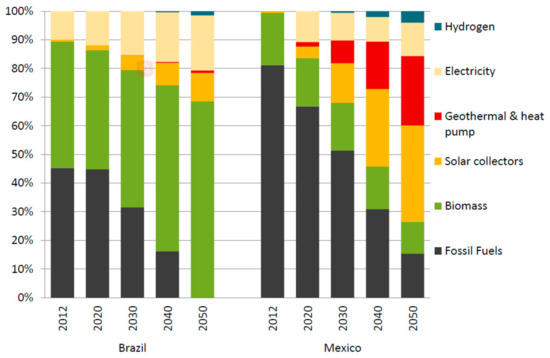 Brazil has already developed a broad portfolio of policy measures accelerating the development of “new” renewable energies across the power, heat and transport sectors [82]. Starting in 2004 with the PROFINA program [83,84], Brazil’s government has developed specific midterm energy planning until 2030 [85], including efficiency development but still a doubling of oil and gas consumption as well as an increase in coal and biomass/biofuels. More recently, the Brazilian government updated the energy plans until 2050 [86] which expects a strong increase in demand. Prospects of renewables changed significantly, projecting a transition towards electric and biofuel vehicle fleet and 20% of buildings equipped with solar collectors. The plan includes over 100 GW of PV installations, 5 GW of distributed biomethane and 650 TJ of solid biomass by 2050.