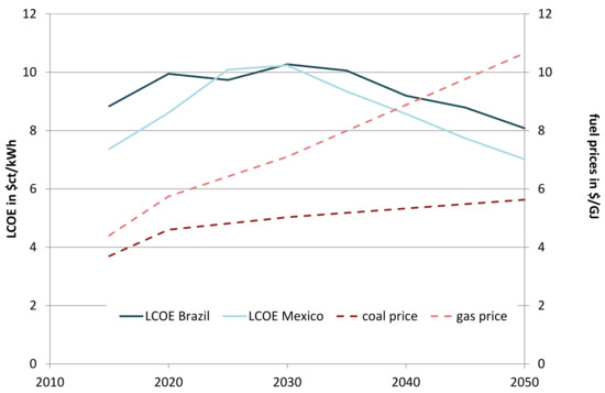 Fossil fuel prices (Table 5) are also based on the WEO 2014 Current Policy scenario [30], extended to 2050 by own assumptions. As there is no world market for natural gas, prices for US were adopted for Mexico and Brazil. Biomass costs are derived from a cost potential curve from [19], representing cheaper costs for Brazil at high availability and in contrast higher costs for Mexico at lower availability.
