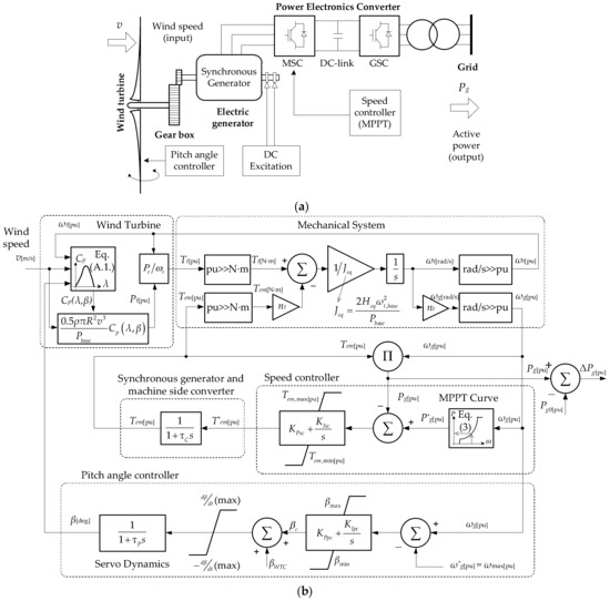 In order to represent the short-time dynamics of the variable speed wind turbine, the simplified electromechanical model proposed in [23] and depicted in Figure 3b has been used. This model, originally designed for a doubly-fed induction generator based wind turbine, can be applied to represent a wind turbine with a synchronous generator via full converter due to the similarities between their mechanical topologies and because, within the time frame considered in the load frequency control studies, the electromagnetic time constants are negligible compared to the mechanical ones. This fact allows to represent the dynamics of the power electronic converter and the electrical generator by a first order transfer function with time constant τC. In Figure 3b, Tt and Tem are the mechanical and the electromagnetic torque, respectively. Pg is the total output active power, ωt and ωg are the angular speed of the turbine and the electric generator, and β denotes blade pitch angle. Pg0 and ΔPg are the pre-disturbance value and the deviation of the output active power, respectively. The variables with the superscript * represent their set-point values. The rest of parameters of both models are defined in the Appendix.