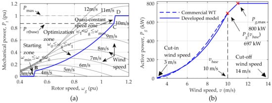 Based on commercial datasheets and real data recorded in field tests performed at the SCHPS, all the parameters of those models have been assigned and tuned in order to represent, in a reliable way, the actual power system performance. Figure 4 shows the power curves particularized for the commercial wind turbine model. In this illustration, the MPPT curve is also plotted, whose analytical representation is expressed in (3). In this equation, Kopt is the optimization constant which depends on constructive characteristics of the wind rotor, and Pmax is the maximum active power to be delivered by the wind turbine. The different operating zones of the wind turbine along with their associated parameters are graphically defined in Figure 4a. Appendix contains all the numerical data necessary for the evaluation of (3).
