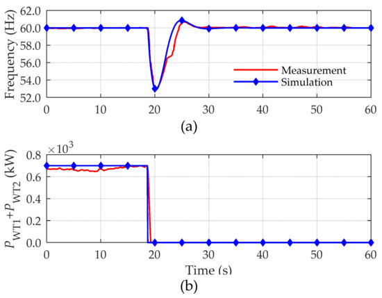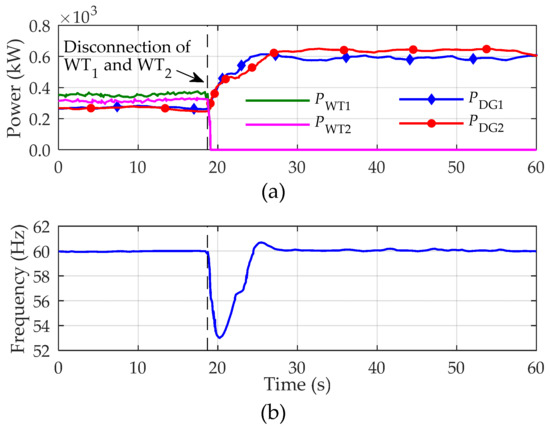The models depicted in Figure 2 and Figure 3 were validated by considering some real contingency situations in the studied power system. For instance, Figure 5 shows the time domain behavior of some variables recorded in the SCHPS as a consequence of a sudden loss of 700 kW of wind energy caused by the intentional disconnection of wind turbines WT1 and WT2. Such disturbance was introduced elapsed 18 s from the beginning of data recording. Prior to the contingency, the electric load was supplied only by the machines: DG1, DG2, WT1, and WT2, whose active power values are provided in Table 2. During the time frame covered by the data acquisition, the actual demanded power hardly experiences any variation, hence, this variable will be kept unchanged along the time domain simulation (ΔPL = 0).