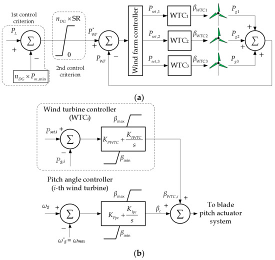 According to the proceeding manual of the SCHPS, the total active power produced by the wind farm, PWF, is regulated by a wind farm controller (WFC) structure as it is shown in Figure 7a. Two criteria are used for dispatching the energy production of the wind farm: ecological and technical. For addressing the first, the active power reference signal, P*WF, is set so that the power demand can be supplied by both the wind farm and the diesel power plant by burning the least possible fossil-fuel. For preserving the efficiency and lifespan of the diesel-engines, it is desirable that they operate above their minimum mechanical power, Pm,min, defined about 25% from its rated value. The total number of online diesel generators is denoted by nDG.