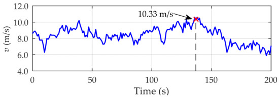 The historical dispatching records of the SHSC reveal that between June and September there is a surplus of wind energy production every year [24]. In a particular case, high favorable wind conditions were registered in the San Cristobal wind farm on August 2015. This condition led wind turbines to cover the energy needs of the island up to 66% under the maximum demand scenario (PLmax = 2424 kW). During the same period, several unplanned power outages were reported. These were mainly caused by the trip of certain frequency protection relays both in the wind farm and in the diesel power plant, by causes still unknown by the operators. Given the technical seriousness of these events, such scenario will be taken as the main case of study in this work. Table 3 and Table 4 list relevant information concerning to the real status of the SHSC for the scenario described above, that approximately corresponds to the highlighted point in the wind speed profile shown in Figure 8. This illustration was generated by using real data measured at the hub height of the wind turbines (51 m) under gusty conditions.