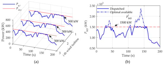 Dispatched active power: (a) Wind turbines; (b) Wind farm.