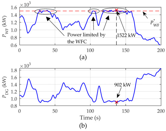 The time domain behavior of the output power delivered by the wind turbine shown in Figure 10a reveals a correct performance in power curtailment around the predefined set point, P*WF = 1500 kW. When the available active power is below the set point value, the wind energy is dispatched according to the optimal wind power conversion criterion, as expected. Complementarily, in Figure 10b, it can be seen that the fluctuating wind power injection is effectively absorbed by diesel generators in order to match the power generation and consumption. It should be noted the similarity between the values highlighted in Figure 10 and those provided in Table 3. This fact allows to validate the implemented SCHPS-model in terms of accuracy.