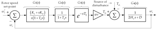 In order to evaluate the disturbance rejection ability of the speed governor while maintaining the rotor speed around its set-point (nominal grid frequency), the closed-loop transfer function that relates the output variable, ωr, and the input variable, TeL, in Figure 12, can be formulated as (5). The transfer functions G1(s)–G4(s) are graphically defined in this figure.