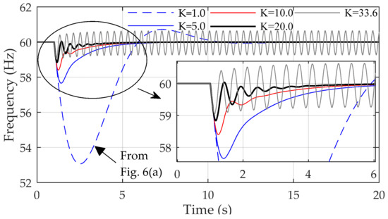 Complementarily, Figure 14 shows the effect of increasing K on the dynamics of the frequency of the SCHPS model implemented in MATLAB/Simulink®. As expected, larger values of K improve the frequency recovery process in terms of the maximum instantaneous frequency deviation (absolute peak value), the recovery time, and the settling time. However, increasing values of K give place to complex conjugated poles (See dominant poles trajectory in Figure 13b), and an oscillation will appear after the frequency rebound, the higher value of K, the more sustained the oscillation. When K reaches its critical value, the power system becomes unstable.
