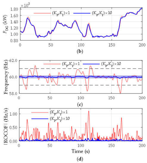 From the results presented in Figure 14, it can be concluded that there is a specific margin for increasing the K gain that could enhance the frequency response of the power system in amplitude and time. However, due to the subjectivity of the term “most suitable” to define the desired frequency response, the selection of the multiplying factor K has to be made by using a purely technical criterion based on three specific objectives: (1) attain a faster response from the controller in the frequency recovery process; (2) reduce the frequency drop and; (3) after the frequency rebound, damp the remaining frequency oscillations in a relative short time. Objectives 1 and 2 are designed to maintain an adequate power quality index and the latter is aimed to avoid causing additional mechanical stress in the diesel engine drives during the frequency control process. In this work, it has been verified that a factor of multiplication of K = 10 allows to fulfill the objectives described before. Figure 15 shows the results obtained by adjusting the diesel-engine controller gains and applying such modifications to the SCHPS model implementation particularized to the case of study presented in Section 2.3. In this figure, it can be seen that the power delivered by diesel generators improves the absorption of the fluctuating wind power injection in order to match the generated and demanded power in the power system. As a consequence, the excursions of the frequency are appreciably reduced, being great part of these within the band of control required by the applicable grid code. Similar benefits can be observed in the evolution of the rate of change of frequency (ROCOF). With the implementation of the corrective actions on the conventional generation, the average value of this variable is reduced by approximately 89%, which leads to substantially reduce the risk of triggering of frequency relays installed at different points in the SCHPS.