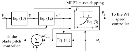 Figure 17 shows the schematic implementation of the proposed strategy in the wind turbine. The values Pset, P1, ω’1 and ω’max, are applied to the WTC, in order to evaluate the MPPT curve and, ω’max to the blade pitch angle controller for a proper rotor speed limitation. Since the proposal is designed to be implemented locally in the WTC associated with the i-th wind turbine, the external configuration of the wind farm controller will maintain its original topology (Figure 7a).