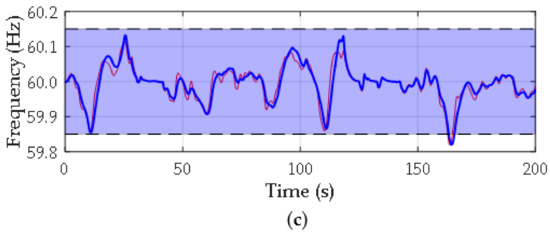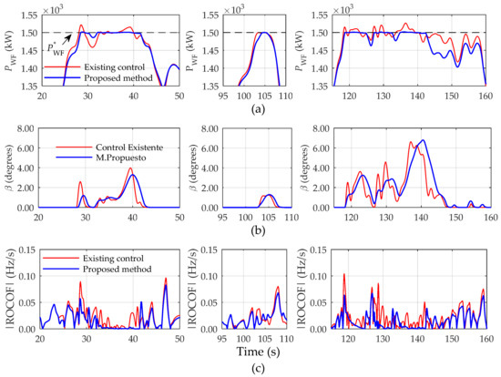 In Figure 18a, it can be seen the notorious improvement in the wind curtailment performance achieved with the proposed method, as expected. Since the control strategy is based on a combined action of electromagnetic and mechanical variables to perform a finer tracking of the set-point signal Pset, the evolution of the blade pitch angle is much smoother as it can be seen in Figure 18b. Regarding the ROCOF, the implementation of the proposal allows to achieve an average reduction of this variable by 21.66% as shown in Figure 18c. Finally, Figure 19 shows the reduction of frequency fluctuations obtained by applying the proposal, specifically in those intervals corresponding to the actions of wind power curtailment. In order to better show the grid frequency excursions in this figure, the scale of the y-axis has been adjusted around the control frequency range specified by the grid-code described in Section 2.4., and it will be kept that way for depicting the rest of results.