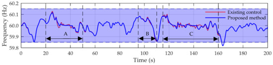 Figure 18 and Figure 19 show the results obtained by implementing the proposal in the SCHPS model for the case of study described in the final part of previous subsection (with the diesel-engine speed governor gains readjusted). These results are compared with those generated by considering the original wind farm controller (blue line curves in Figure 15). In order to better show the time evolution of the variables of interest, only those intervals where the wind power is curtailed (defined as A, B, and C in Figure 15a) are shown in Figure 18. This is because outside these temporal ranges, the dynamics obtained in the two cases compared are practically the same.