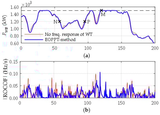The proposals aimed to improve the frequency control actions of the SCHPS, in the previous section, have been discussed and tested by considering normal operating conditions, characterized by a fluctuating behavior of the grid frequency due to the injection of a realistic wind power profile. Although the previous results reveal a significant reduction of frequency deviation and an important decrease of the average ROCOF by applying these solutions, it is essential to consider more severe operating scenarios in which the loss of generation or demand may involve a risk to the power supply continuity. The most probable scenario for the occurrence of a contingency in the actual power system corresponds to the sudden loss of wind generation, a fact that will be considered in the following study. For the test power system, similar operating conditions to those described in Section 3.3. are taken into account, and a new base case is defined. It considers all the improvement proposals introduced throughout the previous section, except the EOPPT-method (red line curves in Figure 22). The disturbance is generated by disconnecting the wind turbine WT3 (Figure 1) at three different instants within the time frame considered in the simulations: points P, N, and M, which have been highlighted in Figure 22a. These points correspond to three operational status of the wind farm that are interesting for the assessment of the EOPPT-method under contingency conditions: