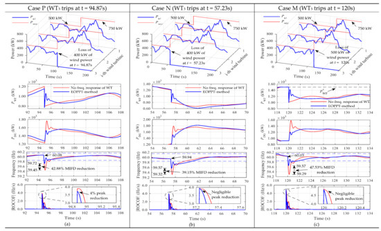 Figure 23 summarizes the results obtained by simulating each case of study.The performance of the power system for the first contingency scenario (Case P) is depicted in Figure 23a. The upper subfigure illustrates the time-domain behavior of the power delivered by each machine installed in the wind farm along with the maximum output power set-point imposed by the wind farm controller, Pset. Note that, at the moment of the disconnection of WT3, the value of Pset increases from 500 to 750 kW. This is because the wind farm output power reference P*WF (Computed as 1500 kW in Section 2.3.) has to be fulfilled only by the remaining two online wind turbines. Since a non-variable load demand profile is considered in the simulation, the value of P*WF will remain unchanged throughout the simulated time frame. The subsequent subfigures show the dynamics of the power dispatched by the wind farm, the behavior of the power delivered by the diesel power plant, the response of the grid frequency, and the evolution of the ROCOF. These illustrations reveal that a sudden loss of wind power of 400 kW causes a grid frequency drop which is effectively mitigated by the wind turbines by implementing the EOPPT-method: the maximum instantaneous frequency deviation (MIFD) is reduced in 42.88% in comparison with the base case. The inertial response from wind turbines helps to the conventional generation in the frequency controls tasks, a fact that can be seen in the diesel power generation subplot, where a milder dynamic of the mechanical power is achieved. Since the increase of active power required for frequency support is backed up by an increase in the available mechanical power, due to dv/dt > 0, a reduction of the maximum rate of change of frequency, |ROCOF|max, is achieved.