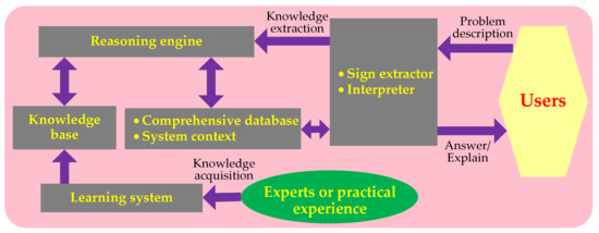 - Learning system: it is the interface with the experts in the practical field, through which, the knowledge of the experts in the field can be extracted, classified and summarized, such that the knowledge is formalized and encoded in the diagnostic knowledge base formed by the computer system.