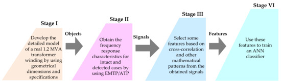 Apart from GRNN in [107], ANN can be combined with other intelligent algorithms for transformer fault diagnosis based on the DGA technique. Ghanizadeh and Gharehpetian [130] proposed a new method which combines ANN with cross-correlation-based features. This developed model is employed to discriminate between mechanical defects and electrical faults, which are as two major faults in power transformer windings. The principle of this model is shown in Figure 2. This proposed method can precisely discriminate among disc-to-disc short circuit faults, radial deformation and axial displacement defects and determine their location or extent with a good accuracy.