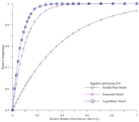 Some studies have been carried out that have taken the heterogeneity of the fracture into consideration [14,15,16,17,18], however, these studies are focused on contamination transport (mass transport) and not on thermal front propagation. From these numerical and analytical studies, two ways of inclusion of fracture heterogeneity were identified. The first is by using a complex geostatistical model, which requires an enormous amount of data, as carried out by James and Chrysikopoulos [18] and Chrysikopoulos and Abdel-Salam [17]. The second is by using a simple mathematic function to represent the fracture heterogeneity, as carried out by Natarajan and Kumar [14]. The authors have previously attempted to analyse the effect of fracture heterogeneity on the propagation of the thermal front in a single fracture-matrix system by using simple sinusoidal and logarithmic functions to represent the fracture aperture [19]. Figure 1, obtained from the data presented by Bagalkot and Kumar [19], shows the spatial distribution of thermal fronts in the fracture for parallel plate and variable aperture models (sinusoidal variation and logarithmic variation) for averaged fracture apertures of b = 150 μm. From Figure 1, two observations may be made. First, there is a considerable difference in temperature profile between the parallel plate model and the variable aperture model represented by sinusoidal and logarithmic functions. Second, it may be observed there is a substantial difference in temperature profile among different variable apertures. The sinusoidal aperture underestimates the thermal equilibrium point (point along the fracture where fluid attains the temperature of rock matrix) in the logarithmic model by approximately 35%. These two observations raised the following questions. Are simple mathematical functions the right tools to represent the aperture variations? If not, are there better ways to represent the heterogeneity of fracture in a numerical model? Answering these questions was the motivation and objective of the present study.