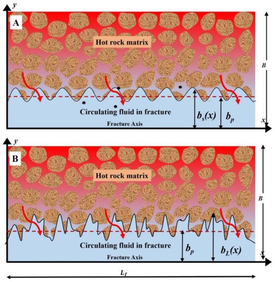 In an EGS, the cold fluid (water) under high pressure is injected into a reservoir consisting of dry hot rocks through an injection well. The high-pressure water circulates through the hot rocks through high-permeability fractures. The interaction of cold water with hot rocks raises the temperature of the circulating water and the hot water is extracted from the production well. Depending on whether the geothermal system is liquid dominated (water) or vapour dominated (steam/steam and water), the extracted fluid at the production site may be water or steam or a combination of both. Figure 2 shows a bisection of a horizontal section of a single horizontal fracture-rock matrix system for three types of fracture aperture variations (parallel, sinusoidal, and LCG-aperture). Figure 2A represents the sinusoidal variation of fracture aperture taken from Bagalkot and Kumar [19]; the sinusoidal mathematical function was based on the self-similarity concept presented by Feder [20]. Figure 2B shows the variation of the fracture aperture obtained from the LCG. In Figure 2, bL(x), bs(x), and bP represent fracture apertures due to LCG, sinusoidal, and the parallel plate models, respectively. Apart from LCG and sinusoidal aperture variation, Figure 2 also shows the difference between the LCG and sinusoidal model with average fracture aperture (b) of the parallel plate model (represented by a red dashed line). In Figure 2, B represents the half fracture spacing, and Lf is the fracture length. Each fracture may be considered symmetrical, as the fracture-rock matrix geometry repeats, and it would be sufficient to consider just one-half for the analysis [21].