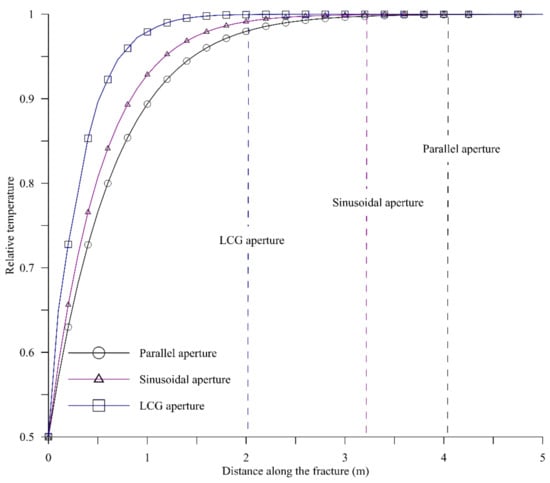 Figure 3 shows the thermal front propagation in the fracture for parallel plate model, sinusoidal model, and LCG-aperture at average half fracture aperture of b = 75 μm, keeping the rest of the parameters the same as in Table 2. Without going into the analysis of Figure 3, the observations clearly indicate “fracture heterogeneity is critical”; simply by altering fracture aperture, a significant difference in thermal front propagation was observed in the fracture. From deeper analysis, two important observations may be made from Figure 2. First, there is a noteworthy difference in the profile of relative temperature in the fracture for different fracture apertures (parallel, sinusoidal, and LCG-aperture). Second, the point of thermal equilibrium (the point at which the circulating fluid attains the temperature of the rock matrix) changes significantly depending on the type of fracture aperture. It may be observed that the for all the fracture types, the temperature profile is logarithmic in nature, however, compared to parallel and sinusoidal fractures, the LCG-aperture profile is more logarithmic, indicating a possibility of greater heat transfer for the LCG-aperture. It may further be observed that the circulating fluid attains thermal equilibrium faster for LCG-aperture, followed closely by sinusoidal and at last for parallel. The vertical line in Figure 3 indicates the point of the fracture where the circulating fluid achieved the temperature of the rock matrix (thermal equilibrium). For LCG-aperture, the thermal equilibrium is achieved approximately 50% before the parallel aperture, and around 30% before the sinusoidal aperture. Hence, both LCG and sinusoidal models—which take heterogeneity into account—perform better than parallel aperture. This is primarily due to the absence of fracture heterogeneity in the parallel aperture. The heterogeneity (undulations of fracture wall) of fracture wall enhances the surface area, which may lead to a greater and faster heat transfer at the fracture-rock interface. Therefore, the fluid attains equilibrium faster for LCG and sinusoidal models than for parallel plate model. Further, the presence of the undulations (heterogeneity) would alter the velocity of the circulating fluid, which ultimately would affect the convection (represented by the first term on RHS of Equation (1)) and thermal dispersion (third term on RHS of Equation (1)). A similar theory of surface area may be attributed to the better performance of LCG over sinusoidal model. From the data obtained from a numerical model, the LCG-aperture shows approximately 15–20% greater surface area compared to the sinusoidal aperture for the same average fracture aperture. This indicates that the LCG-aperture, which is more near reality, would actually lead to a greater heat transfer than the simple sinusoidal variation.