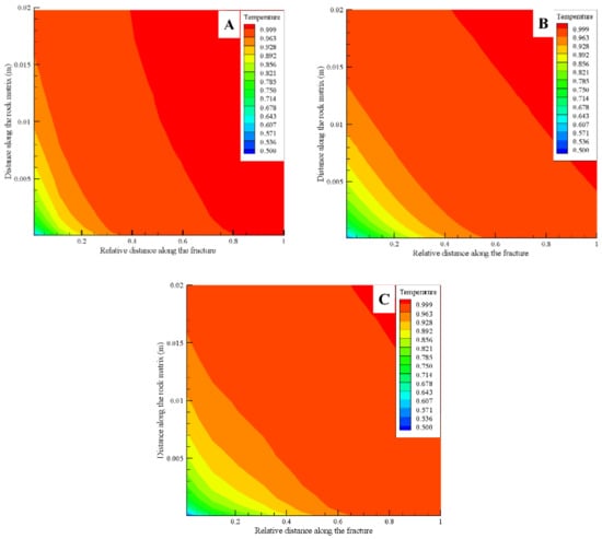 Contour representing the relative temperature variations in the rock matrix for parallel (A), sinusoidal (B), and LCG (C) fracture types at 100 days.