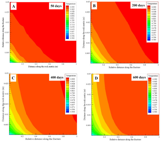 Contour representing the relative temperature variations in the rock matrix for the LCG-aperture model at 50 (A), 200 (B), 400 (C), and 500 (D) days.
