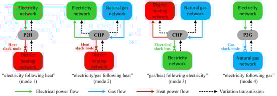 - Four typical operation modes of an EGH-IES (i.e., “electricity following heat” mode, “electricity/gas following heat” mode, “gas/heat following electricity” mode and “electricity following gas” mode) are presented and discussed with a focus on the variation transmission among the three subnetworks.
