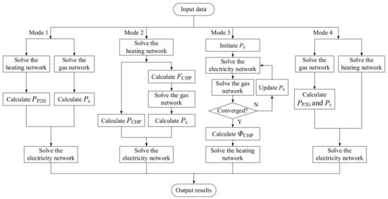Steady-state models of an EGH-IES (Equations (1)–(13)), together with the operation modes presented in Section 3, constitute the deterministic energy flow (DEF) problem of the EGH-IES, which can be effectively solved by the Newton-Raphson method. Solution strategies for solving this DEF problem can be divided into two groups: the integrated method and the decomposed method. The integrated method solves all of the DEF equations simultaneously based on a unified Jacobian matrix, while the decomposed method solves the decoupled equations of each subnetwork successively and can deal with the operation modes of the EGH-IES effectively. Therefore, the decomposed method is used in this paper to solve the DEF problem, and different solving sequences are introduced to deal with the subnetworks according to the operation modes. A flowchart of the decomposed method considering the four typical operation modes is shown in Figure 3.