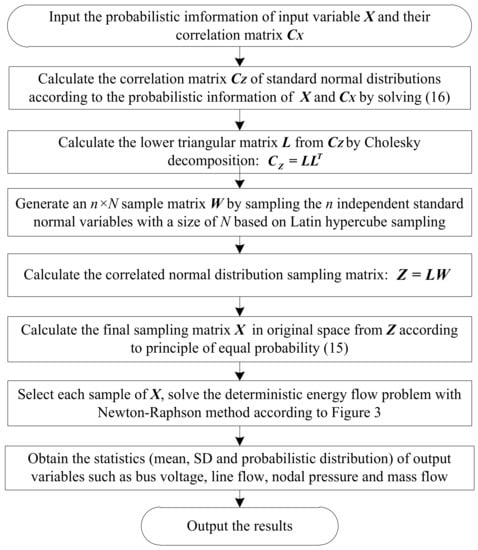 Probabilistic power flow analysis, which has been studied extensively, is a powerful tool for recognizing and evaluating the effects of uncertainties on electricity networks [,]. It is therefore logical and desirable to extend the probabilistic power flow technique to the multi-energy flow analysis of IES. Chen et al. [,] presented a probabilistic power and gas flow model considering uncertainties in wind speeds and electricity/gas/heat loads, and then solved the problem by Monte Carlo simulation (MCS). Hu et al. [] applied the cumulant method and Gram-Charlier expansion to conduct probabilistic power and gas flow analysis. Yang et al. [] investigated the effects of uncertainties and correlations in pipe parameters on power and gas flow of an electricity-gas IES. Sun et al. [] studied probabilistic power and mass flow of combined electricity and heating networks considering uncertainties in photovoltaic power and electricity/heat loads.
