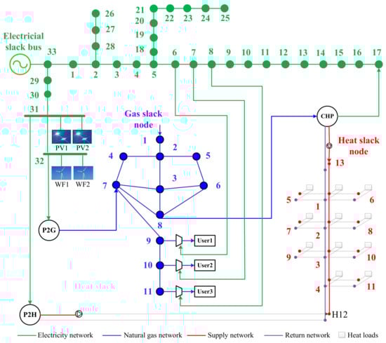 - Shabanpour-Haghighi, A.; Seifi, A.R. An integrated steady-state operation assessment of electrical, natural gas and district heating networks. IEEE Trans. Power Syst. 2016, 31, 3636–3647. [Google Scholar] [CrossRef]
