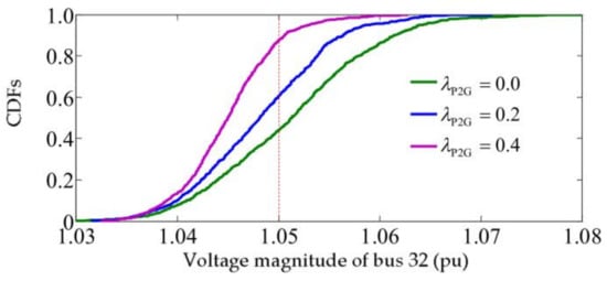 As shown in Figure 6, the CDFs of voltage magnitude of node 32 vary dramatically as λP2G changes. When P2G is off (λP2G = 0), the probability of the voltage magnitude at bus 32 exceeding its upper limit (set to be 1.05 pu) is up to 56.1%. However, this probability is dramatically reduced to 40% when λP2G = 0.2 and 12.6% when λP2G = 0.4. This indicates that the high wind and solar power output pose a high overvoltage threat to the electricity network, and the utilization of P2G can effectively alleviate this threat.