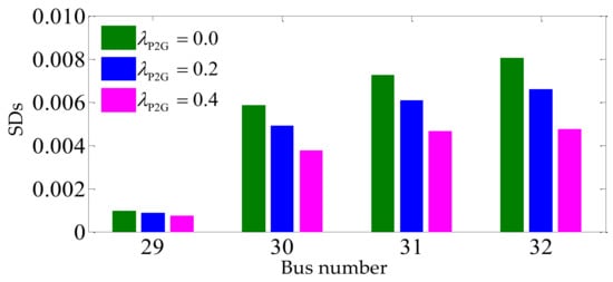 From Figure 7, it can be seen that the SDs of voltage magnitude of bus 32 (connected to wind farms), bus 31 (connected to solar plants) and bus 30 (close to bus 31) are much greater than that of bus 29. This indicates that buses 30~32 are affected greatly by the volatility of wind/solar power. It’s worth mentioning that as λP2G increases, there is a dramatic decrease in the SDs of voltage magnitude, especially at buses 30~32, which suggests that the utilization of P2G can also reduce the voltage fluctuation posed by the variable wind/solar power.