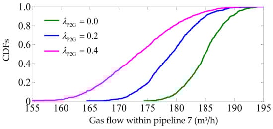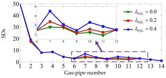 As shown in Figure 8, as λP2G increases, the gas flow within pipeline 7 tends to decrease, and thus the possibility of gas overloading also decreases. On the other hand, as λP2G increases, SDs of gas flow within pipeline 7 obviously increases (see Figure 9), and so does that of pipeline 10 (connected to gas nodes 6 and 8) and pipeline 11 (connected to nodes 7 and 8). These observations indicate that the utilization of P2G is helpful to reduce the overloading risk of the gas network, but may introduce harmful fluctuations resulted from uncertain wind/solar power to the gas flow especially within the pipeline directly connected to node 7 (to which the P2G is connected) and its nearby pipelines.